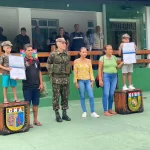 As crianças receberam um distintivo e o chapéu bandeirante no Centro de Instrução de Guerra na Selva (Cigs)