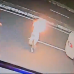 O momento em que ela tentava escapar das chamas foi registrado por câmeras de segurança do estabelecimento nas redondezas