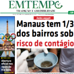 O jornal impresso Em Tempo do dia 26/07/2024 destaca: Manaus tem 1/3 dos bairros sob risco de contágio.