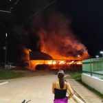 Fogo começou após parte do telhado ceder sobre os tijolos em queima; ninguém ficou ferido.