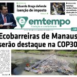 O jornal impresso Em Tempo do dia 5/11/2025: Ecobarreiras de Manaus serão destaque na COP30