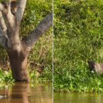 Felino espera no alto de árvore e surpreende jacaré com ataque inesperado em rio do Pantanal.