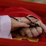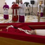 Em uma delas, o cardeal Pietro Parolin, secretário de Estado da Santa Sé, aparece em oração ao lado do caixão de madeira que guarda o corpo do líder religioso
