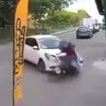 Colisão lateral registrada por câmeras deixa motociclista caído e alerta motoristas para atenção no trânsito