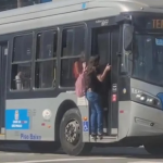 VÍDEO: Mulher é flagrada pendurada em porta de ônibus