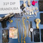 Foram apreendidos entorpecentes, arma de fogo, munições e uma motocicleta roubada
