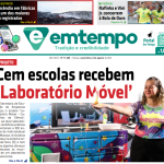 O jornal impresso Em Tempo do dia 8/08/2025 destaca: Cem escolas recebem ‘Laboratório Móvel’