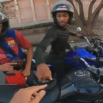 As cenas, registradas pela câmera no capacete da vítima, mostram o momento em que ele leva uma fechada de outro motociclista