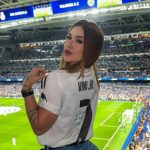 Influenciadora acompanha partida no Santiago Bernabéu e aumenta rumores de romance com o jogador brasileiro.